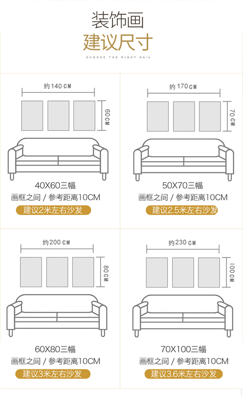 The sofa must be larger than the area of the hanging picture. Thus when we choose the hanging picture, whether it is a piece or a group, the maximum width should not be greater than the width of the sofa to avoid apperaing top-heavy.